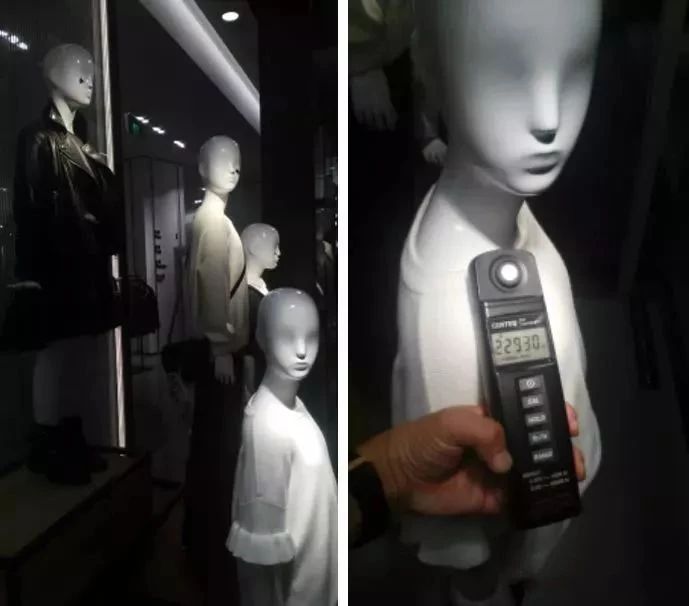 ▲ZARA櫥窗, 照度計(jì)實(shí)測22930 lx,極高亮度的重點(diǎn)照明,目的就是吸引人們注意力,同時(shí)余光足夠滿足人們就近觀察商品的色澤、質(zhì)地